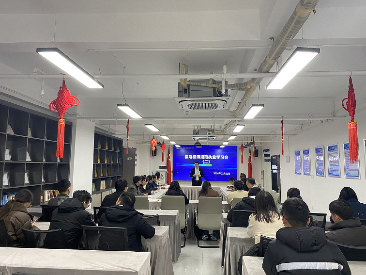 2024年2月22日,我所在会议室组织规范律所律师执业行为学习会。这是律所主任履行第一责任人责任组织召开的第二次学习会。所主任陈仕菊、副主任樊国民、高级合伙人罗婷、田仁洪、简应军及部分律师参加了学习。