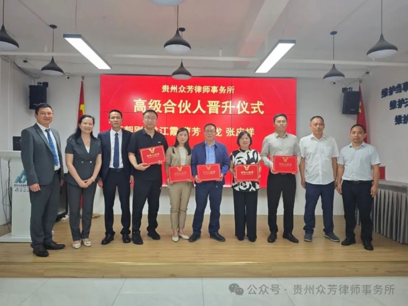 2025年6月6日下午,贵州众芳律师事务所举行了一场庄重而喜悦的盛典——丁朝刚、龙江霞、曹芳、张应祥、陈龙等六位优秀律师正式晋升为高级合伙人!律所全体同仁齐聚一堂,共同见证这一重要时刻。